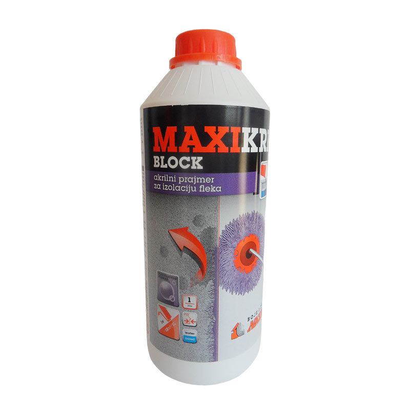 Površina mora biti: tvrda, suva, nosivo sposobna, očišćena od prašine, masnoća, trošnih delova i starih premaza. Pre upotrebe MAXIKRIL Block razrediti vodom u odnosu 1 : 3. Nanošenje vršiti četkom, valjkom ili mašinom za špricanje, u jednom sloju. Vreme sušenja, pri optimalnim uslovima je min. 24 sata. Površine tretirane prajmerom MAXIKRIL Block posle sušenja obavezno premazati disperzionom bojom MAXIDIS ili ULTRADIS, a prema uputstvu proizvođača. Posle upotrebe, alat odmah oprati vodom.