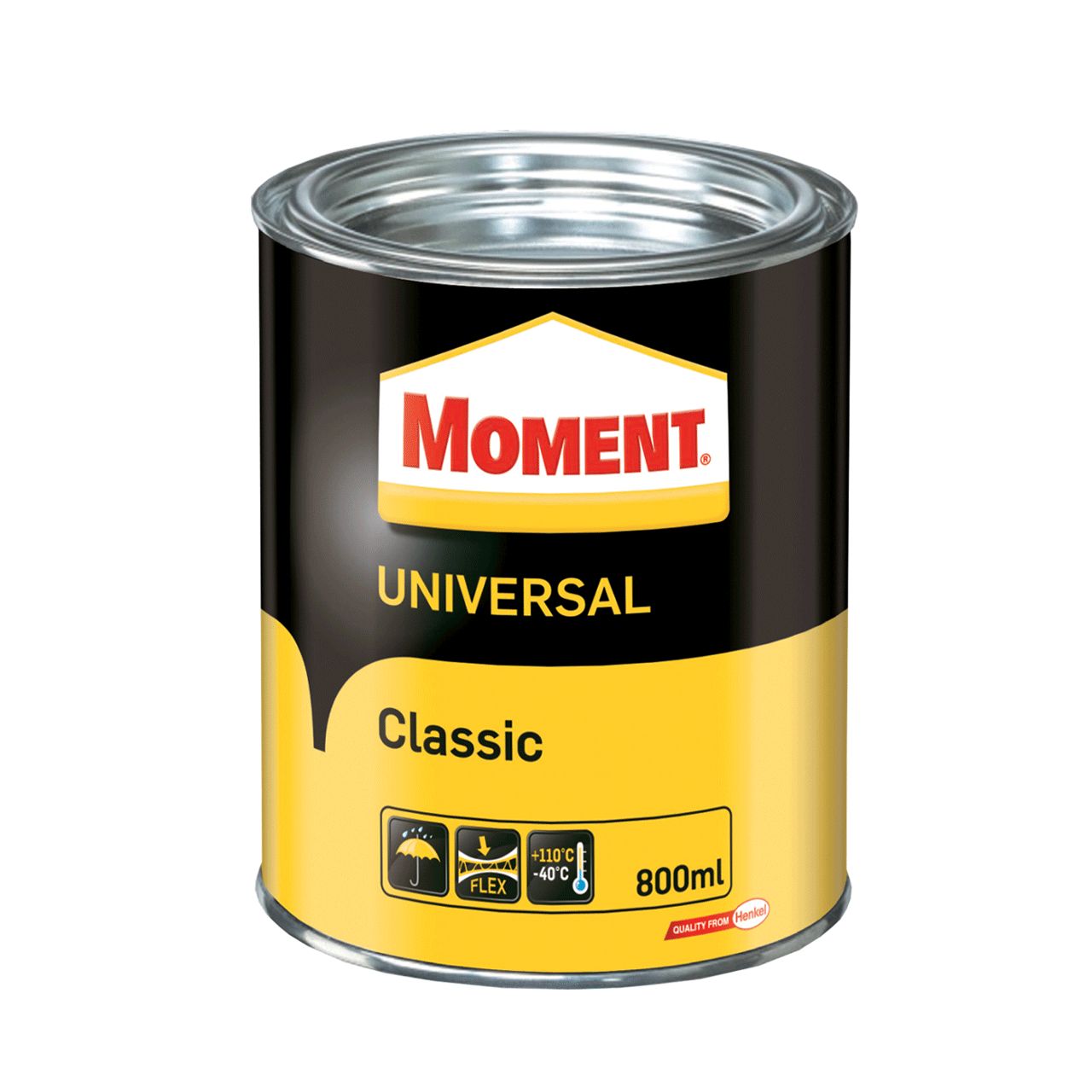 Moment Univerzalni lepak 800ml je za višenamesku upotrebu. Koristi se za upijajuće i neupijajuće površine. Spojevi su postojani, vodootporni, elastični i otporni na visoke temperature. Odmah podnose opterećenja. Koristi se za dekorativne i stolarske radove. Područje upotrebe uključuje drvo, sintetičke materijale, gumu, plutu, kožu, filc, tvrd PVC, metal i plastiku.